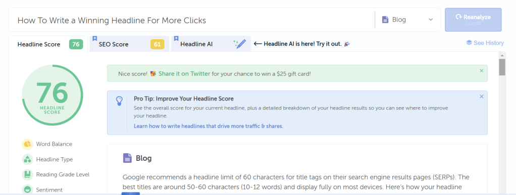 They provide the nitty-gritty information about what to change about your headlines to make them better. Here is an example of a headline I analyzed – “How to write a winning headline for more clicks”;