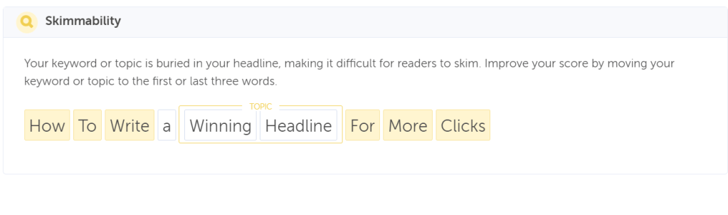 It shows your headline’s score, and how it will show on SERPs. You also get suggestions on how to make the headline better, and more tips on how to make it easily skimmable.