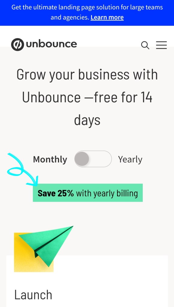 The CTA above by Unbounce tells the user exactly what to do. It also offers a discount, which is meant to persuade customers to take that action.